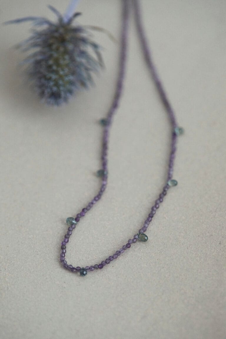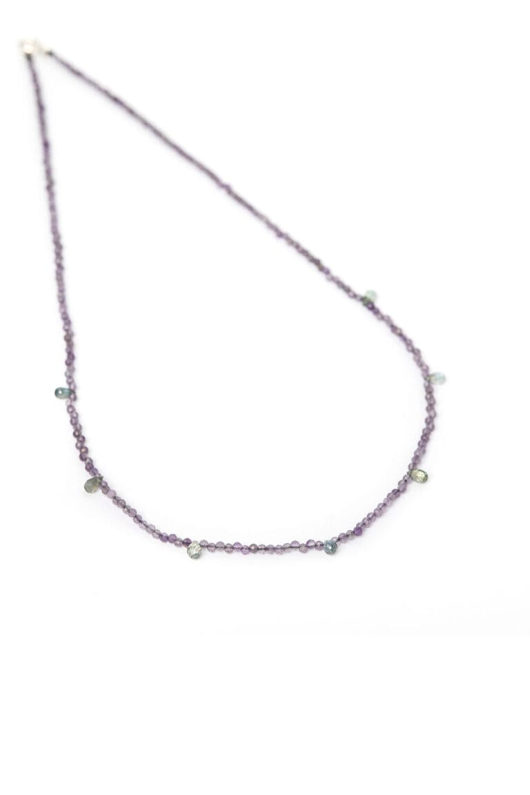 Amethyst bead necklace with green sapphire tears and silver clasp.