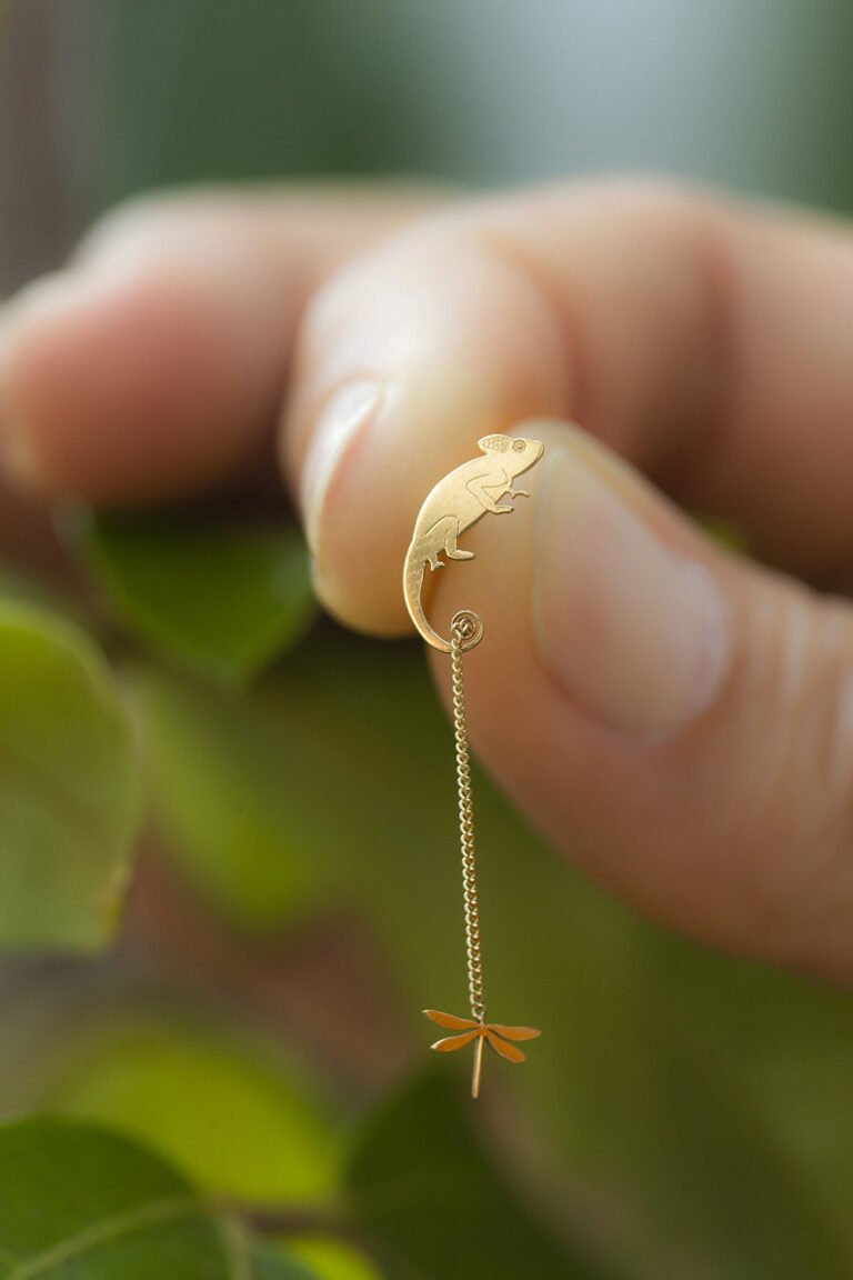 Discover the Chameleon with Dragonfly Earring, a unique jewel that combines the vibrant design of a chameleon with the delicacy of a dragonfly. This earring is perfect for those looking for an accessory that reflects their love of nature and art.