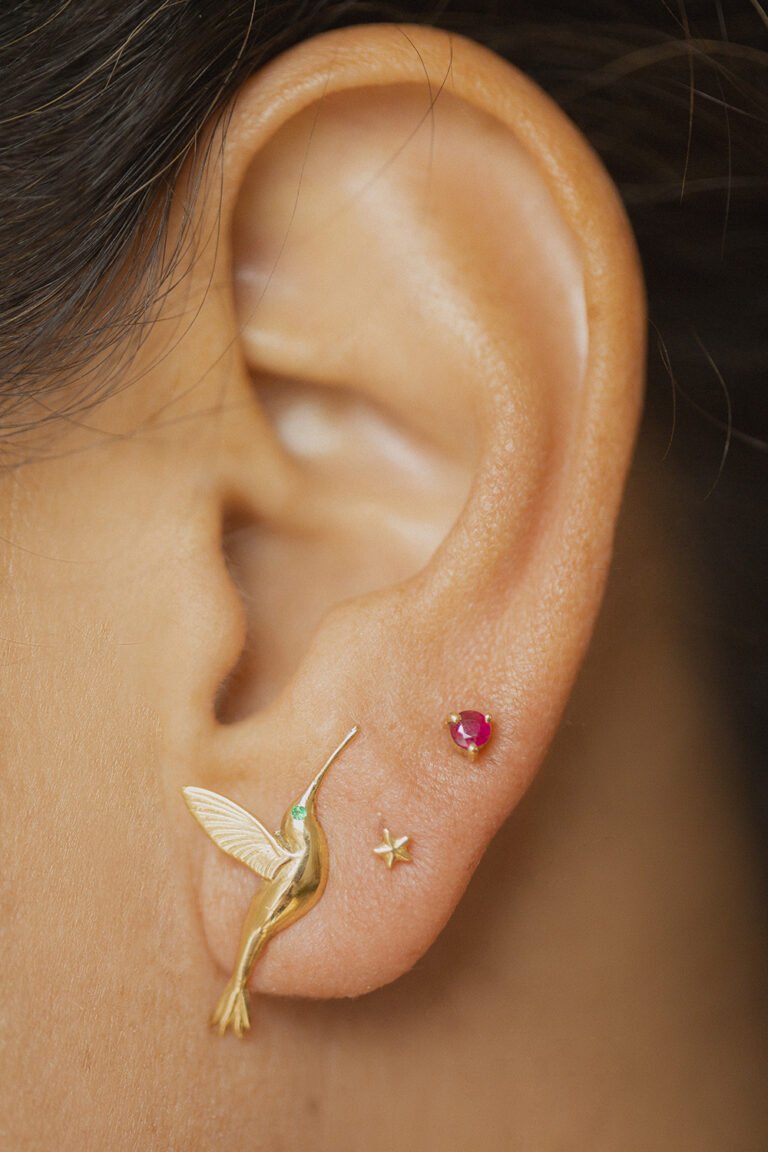 18kt gold earrings, hummingbird. handmade piece with emerald settings in the eyes. Hummingbird: 1.2 x 1.4cm. Emerald: 1.1mm