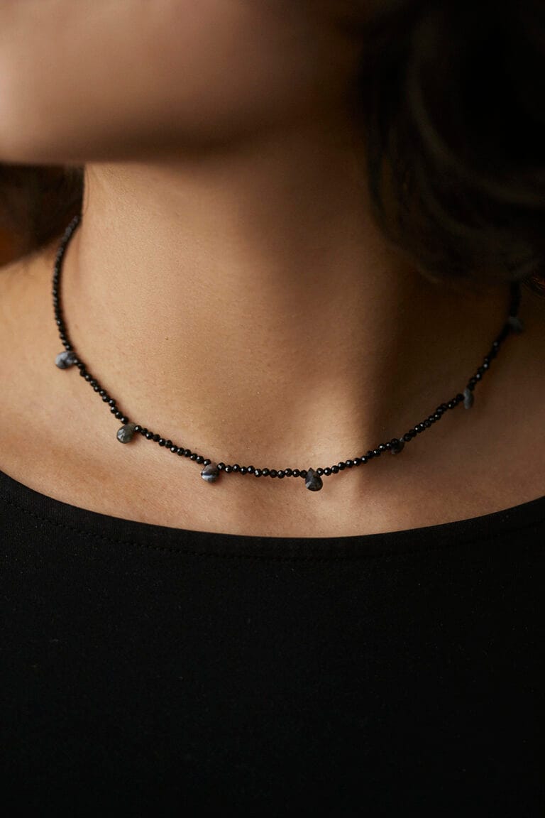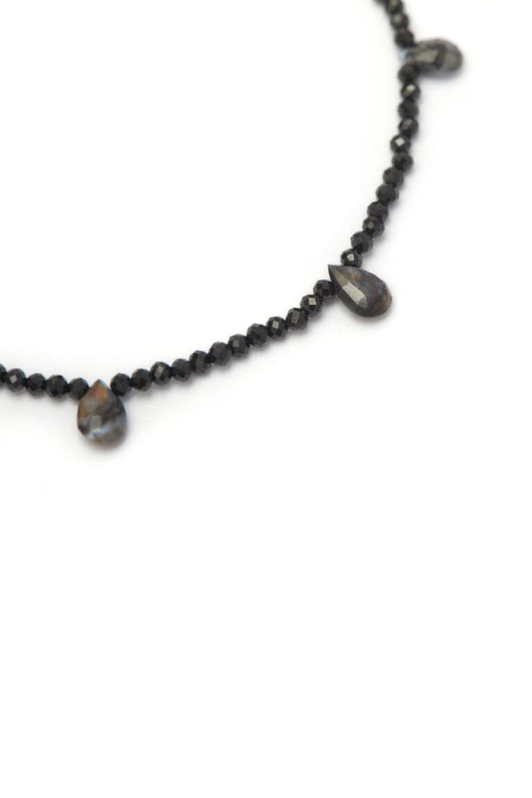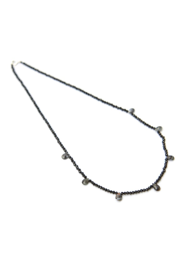 Black spinel and alexandrite tears necklace and silver brooch.