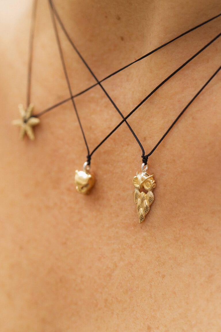 Necklace with bronze owl-shaped charm with black satin cord and 950 silver clasp.