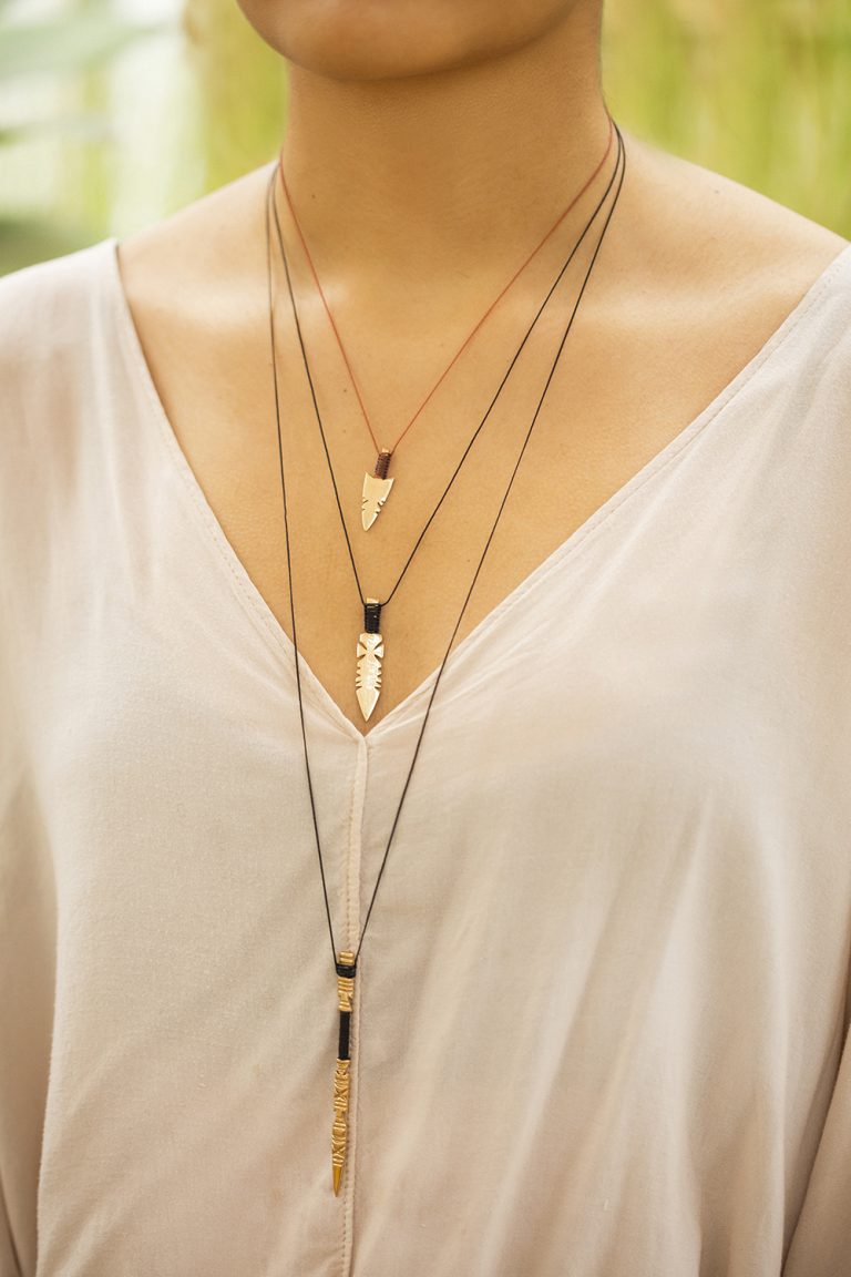"Necklace with satin cord and bronze arrow. Length: 42cm, Pendant: 1x3 cm. Bronze and satin cord."