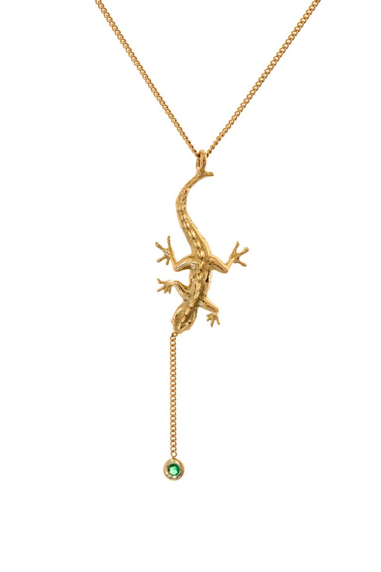 Necklace with chain and iguana pendant with emerald, in 18kt gold. Iguana: 2 x 1cm. Emerald: 2mm. Chain: 44cm