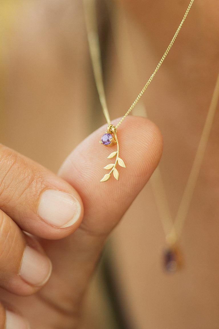 Discover the Gold Necklace with branch charms with leaves and Amethyst 2mm, a jewel that combines the sophistication of gold with the vibrant beauty of amethyst. This necklace is perfect for those looking for a complement that brings a touch of color and elegance to their style.