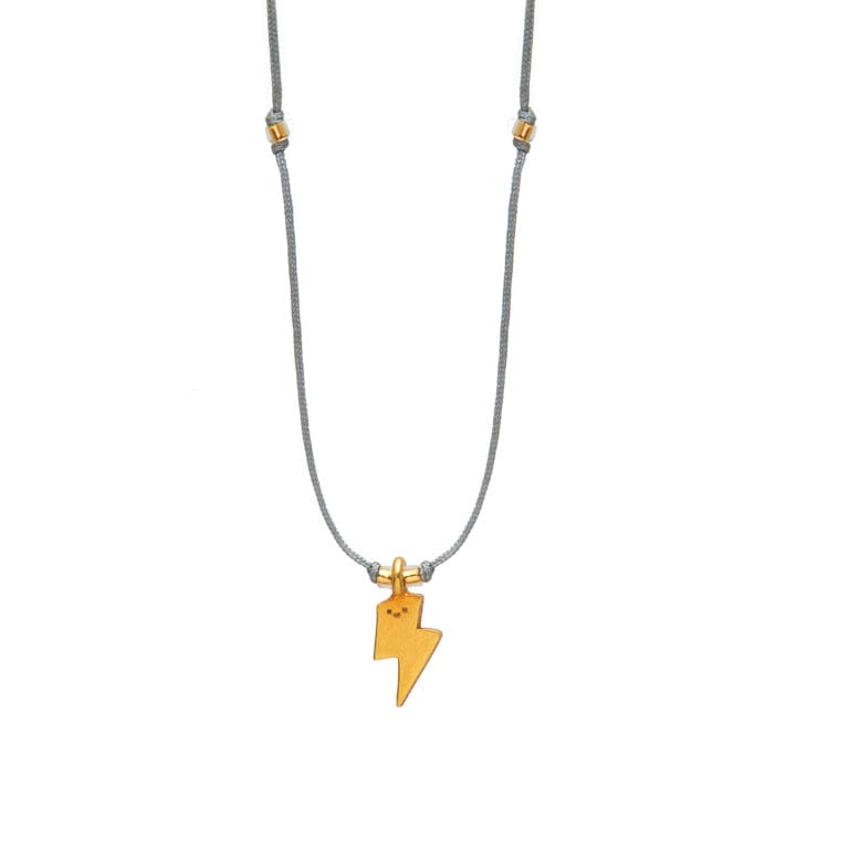 Gold-plated silver lightning bolt pendant necklace with a cut-out face, suspended from a satin cord.