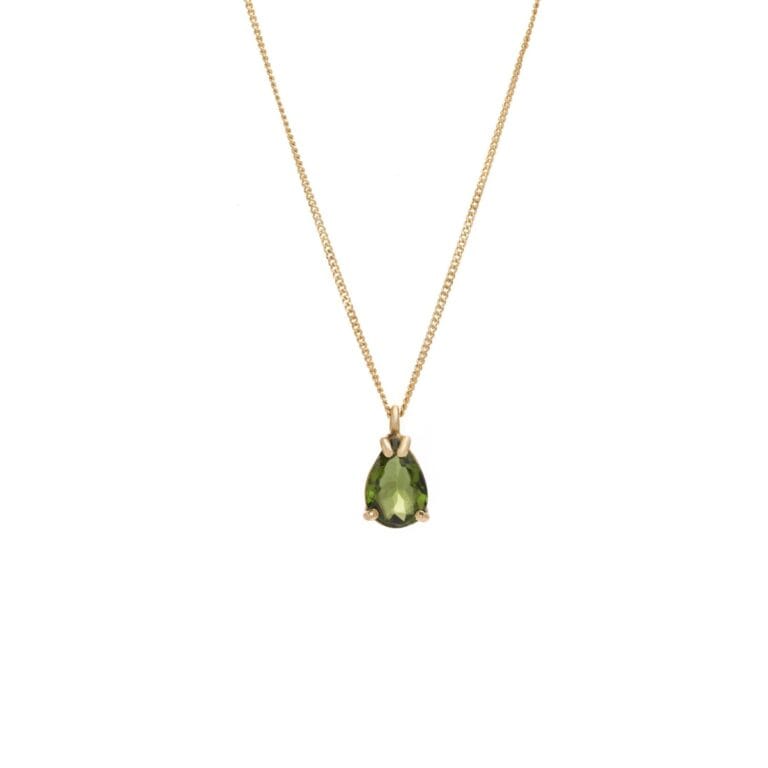 Green tourmaline drop pendant 5x7mm with 18kt gold prong setting.
