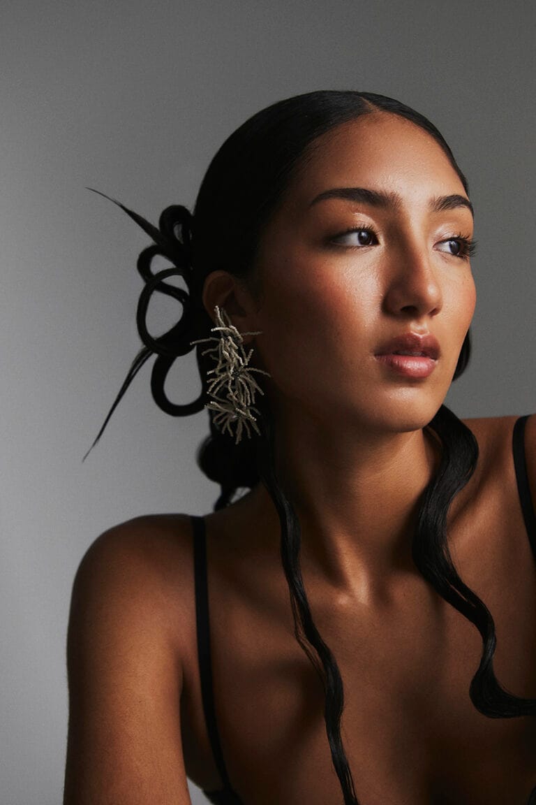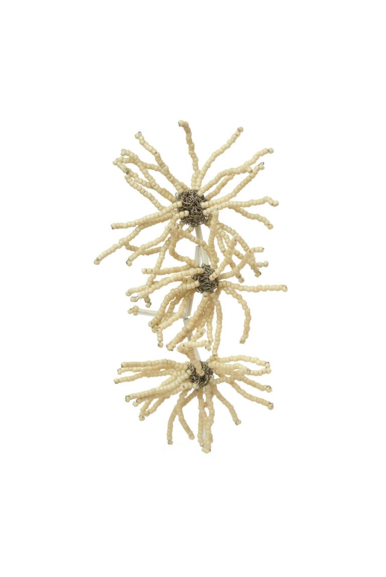 Lightning bolt-shaped earring, woven with steel wire and seed beads.