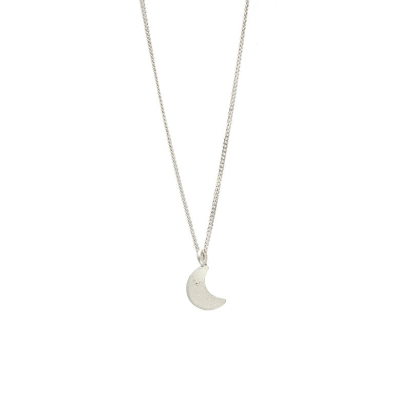 Silver moon pendant necklace with a cut-out face, hanging from a silver chain.