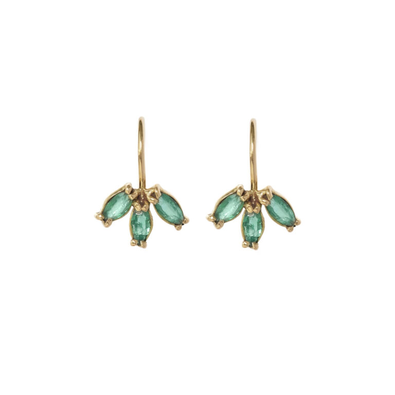 Arete con 3 almendras de esmeralda de 3.5x7mm engastadas con uñas en oro de 18kt.