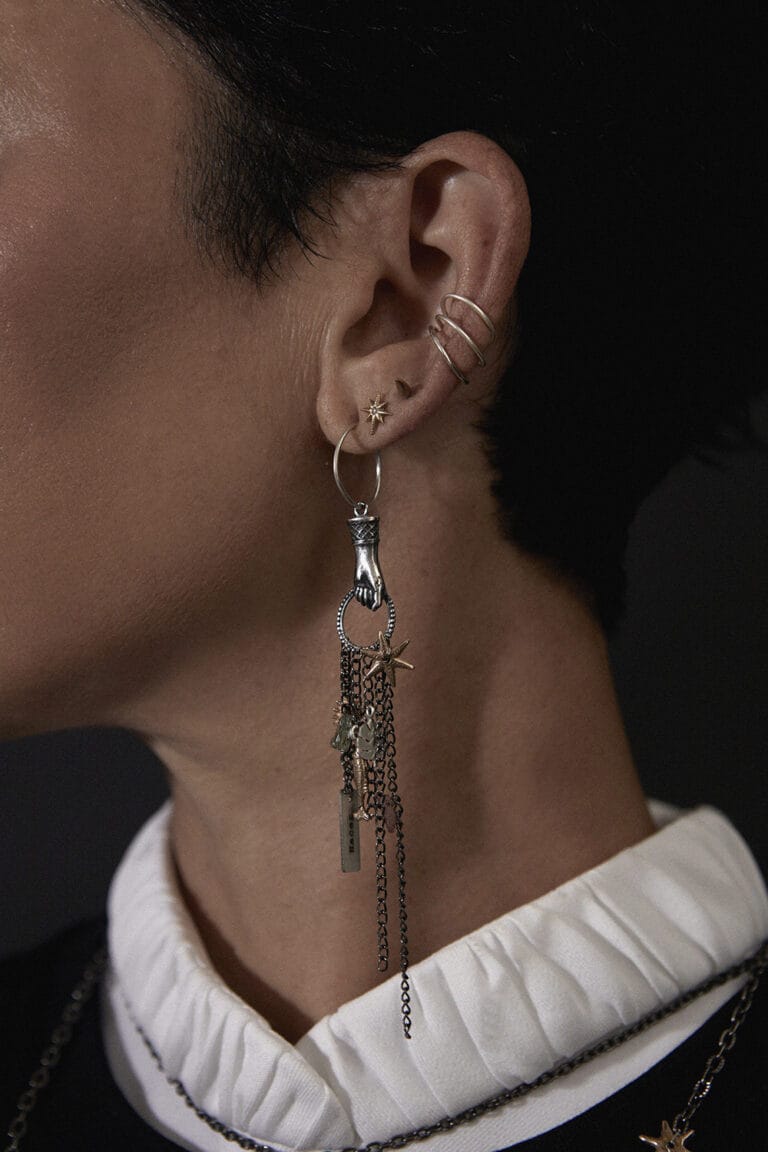 Arete, con cadenas de bronce con baño metalizado, con varios dijes en bronce, plata y turmalinas.