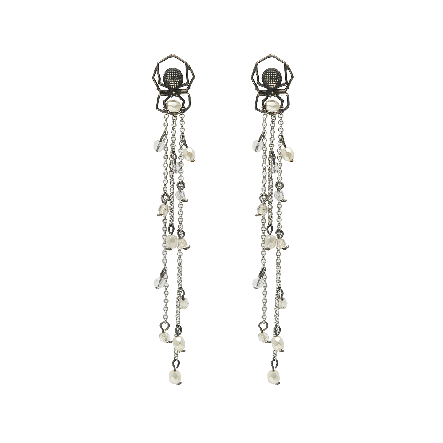 Arete en froma de araña de plata quemada 925, con cadenas de brass y cuentas de cristales checo. Largo : 8.2 cm