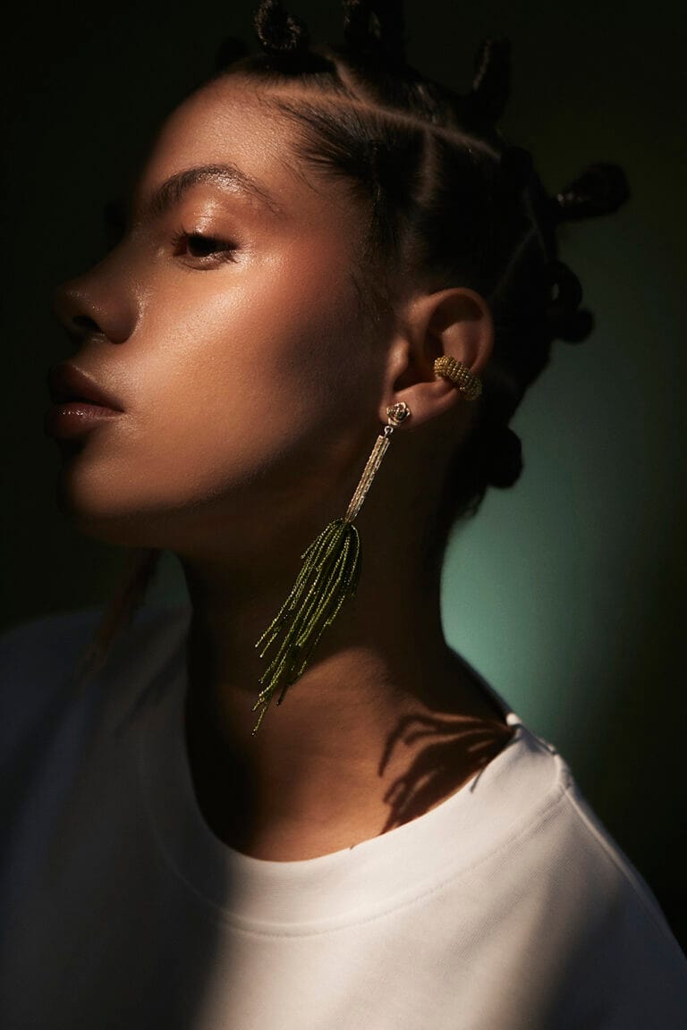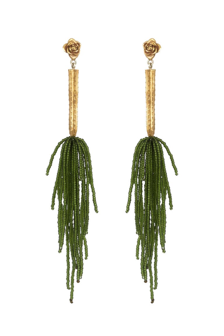 Arete en forma de roseta de suculenta y cactus san pedro, con mostacillas colgantes.