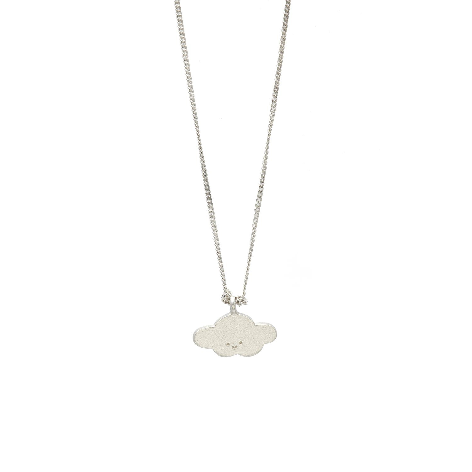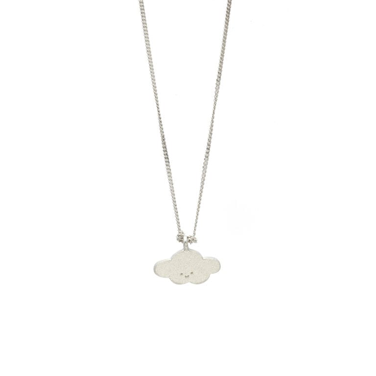 Collar con dije en forma de nube de plata, con una carita calada, colgada de una cadena de plata.