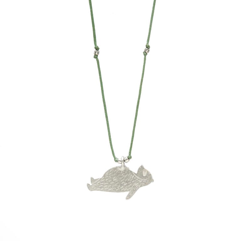 Collar con dije en forma de oso echado de plata, con una carita calada, colgada de un cordón de satín.