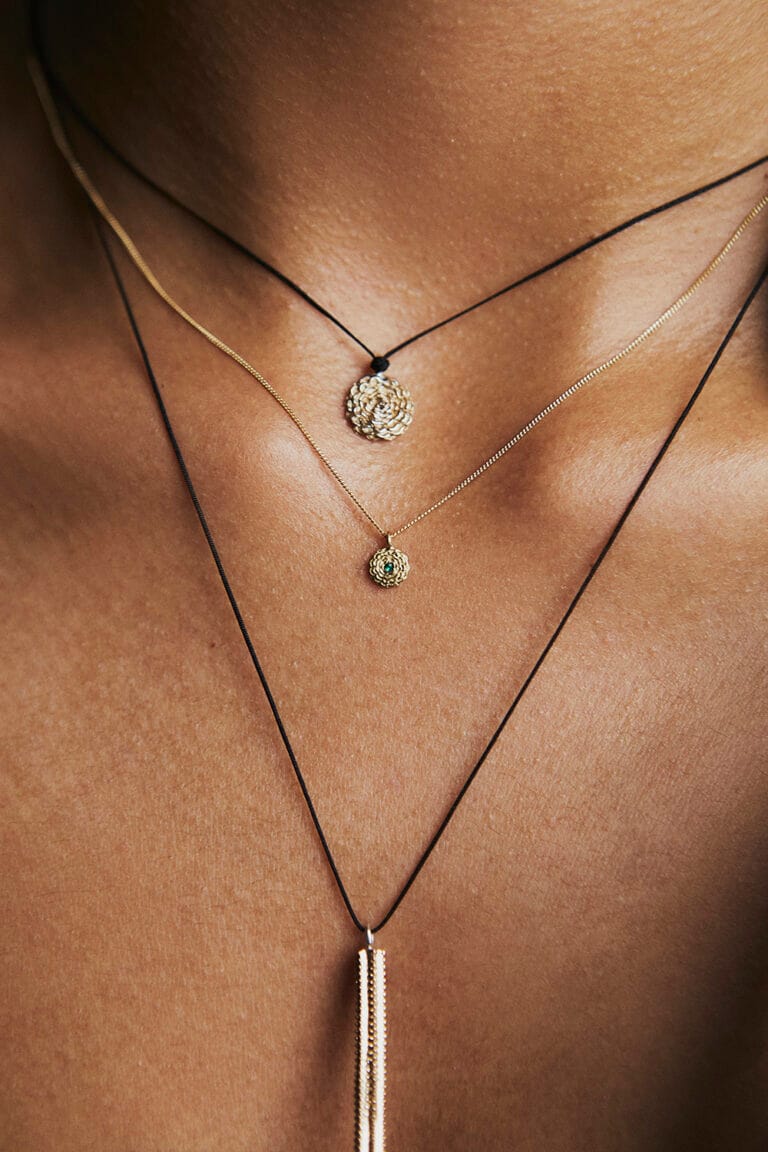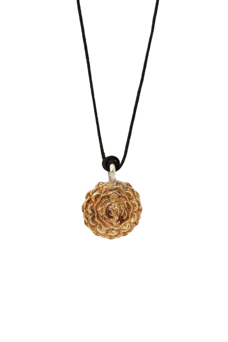 Collar con dije de bronce en forma de rosa de jericó y cordón de satín.