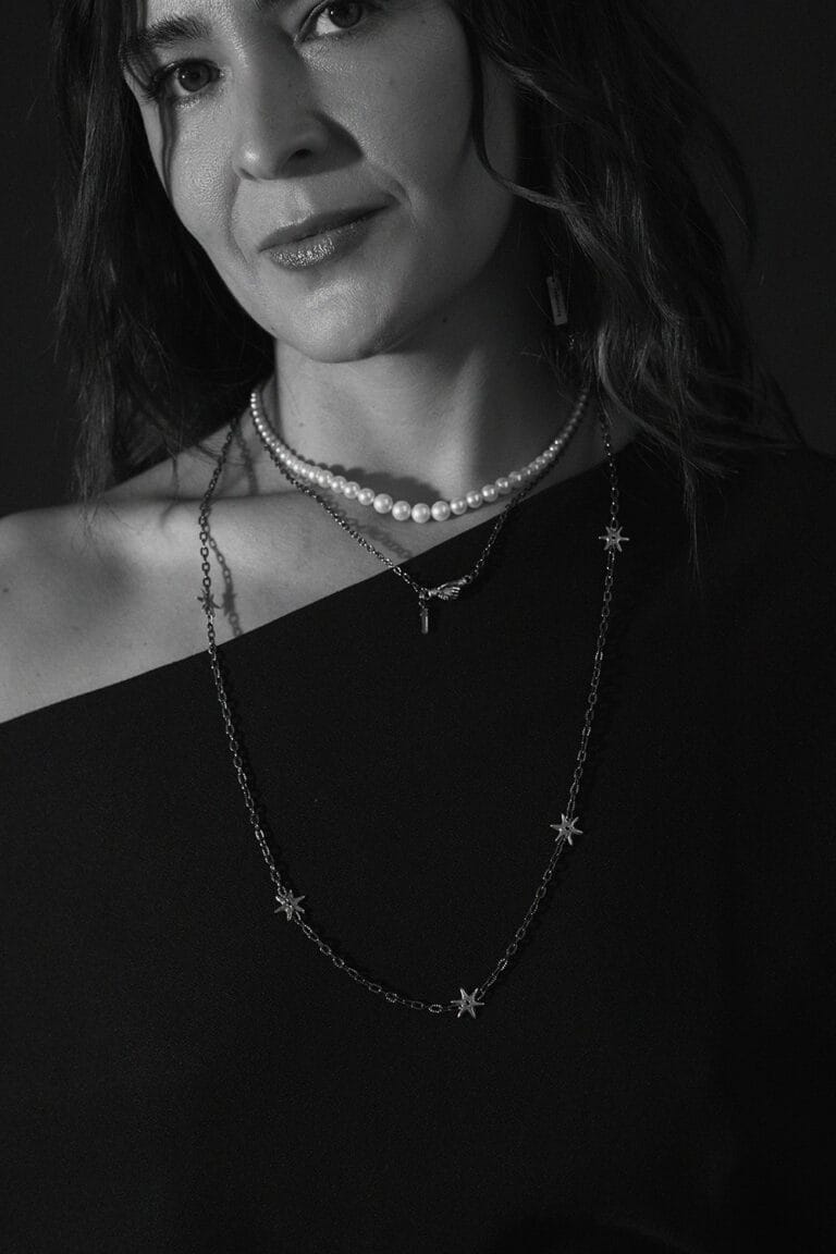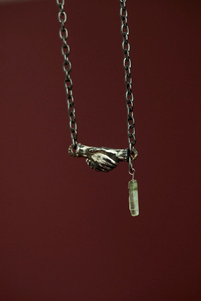 Collar con cadena de bronce con baño metalizado, manos de plata y turmalina verde.