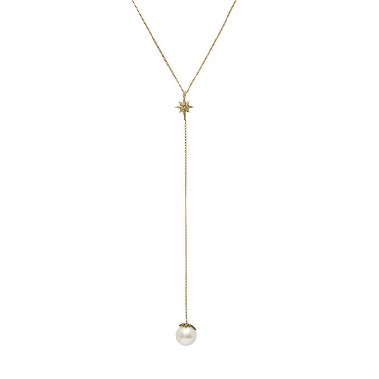 Collar en oro 18K con perla blanca 3A, diamante y estrella, un clásico atemporal.