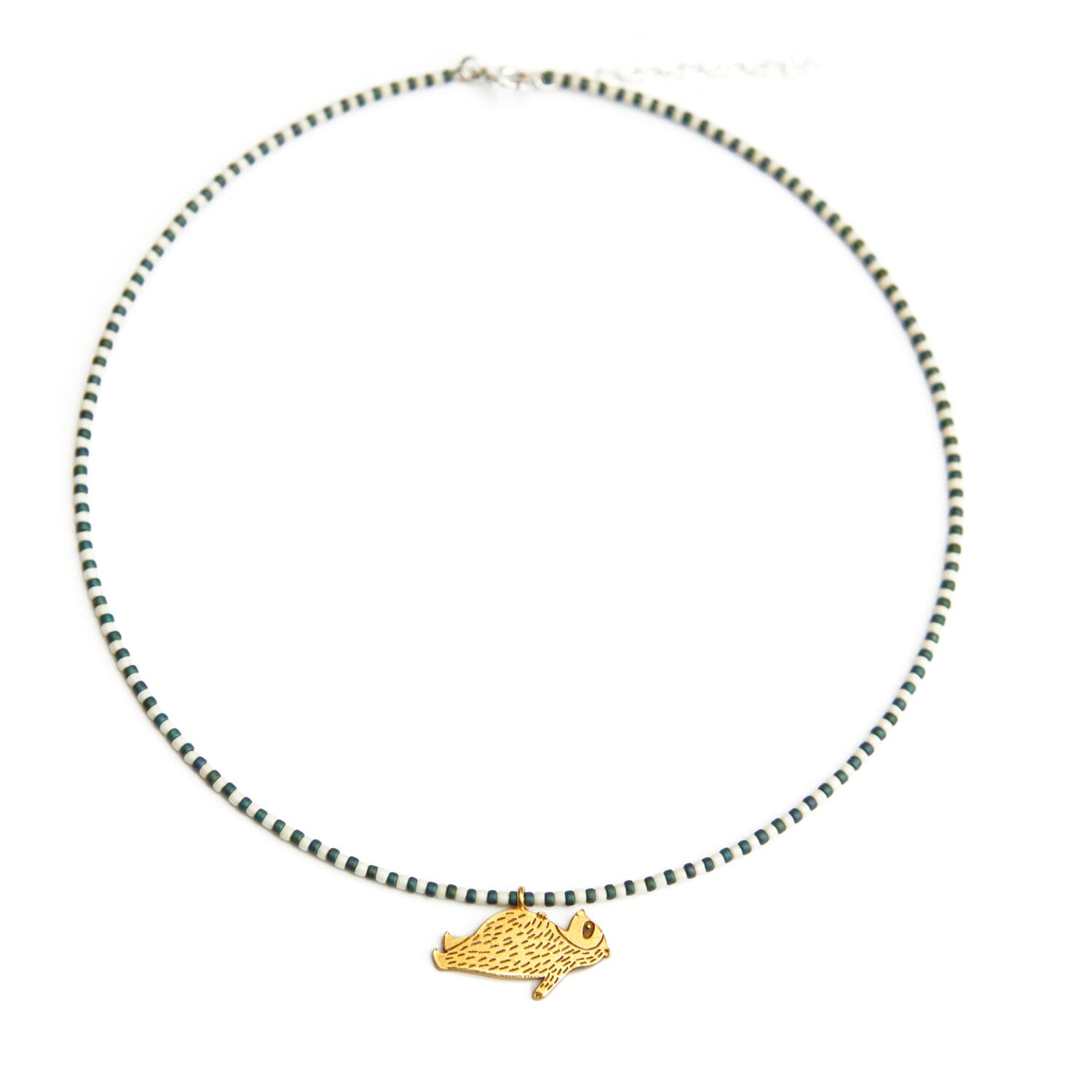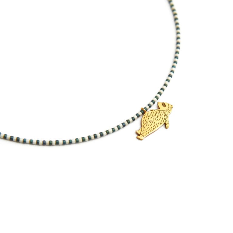 Gargantilla con dije en forma de oso echado de plata bañado en oro con mostacillas.