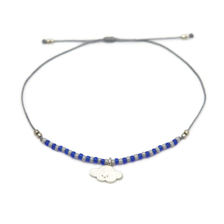 Pulsera con dije en forma de nube de plata, con una carita calada, colgada de un cordón de satín con mostacillas.