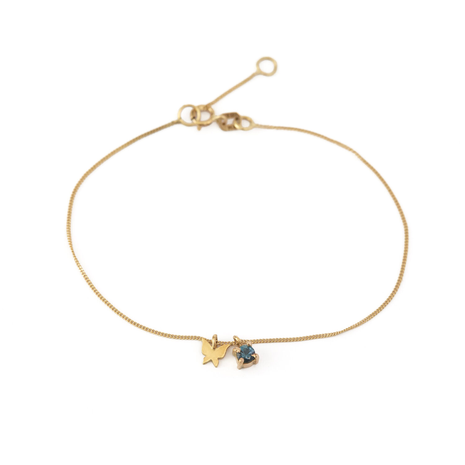 Pulsera con dijes de mariposa y topacio azul de 3mm engastado con uñas en oro de 18kt.